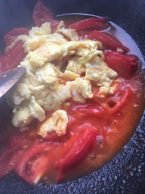 热锅凉油,油温五成热,倒入打散的鸡蛋,快速翻炒,然后起锅(一定要快,不要把鸡蛋煎老了),倒入西红柿翻炒,放少许盐,炒除汤汁,倒入炒好的鸡蛋,翻炒放少许鸡精,起锅装盘