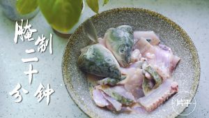 加入腌鱼包,揉匀。然后加一瓶盖白酒。