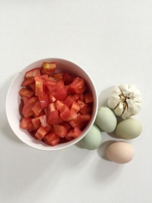 准备好材料:土鸡蛋4个打散,搅拌均匀,,蒜瓣剁碎,西红柿洗净切成小丁备用!