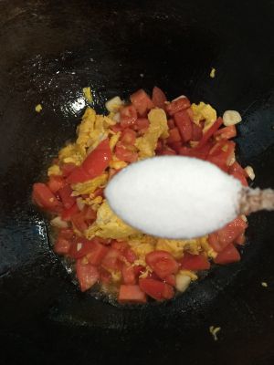 倒入西红柿快速翻炒至出汁 倒入已煎好的蛋 继续翻炒 途中下少量糖 盐