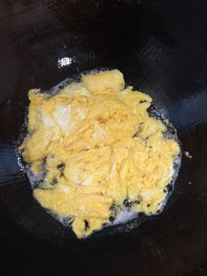 起锅烧油,五分热加入鸡蛋翻炒,凝固后出锅备用。