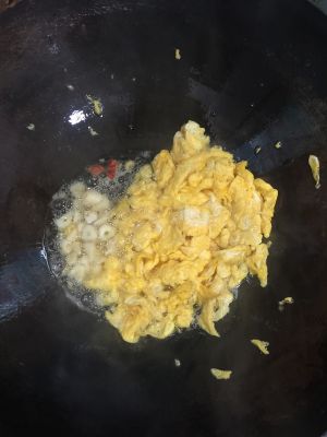 把翻炒熟的鸡蛋拨在锅的一边,放入蒜瓣和干辣椒炒出香味!