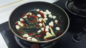 原则上,把鱼捞出,然后把葱、姜、蒜、辣椒放入余的油爆出香味,然后再把炸好的鱼放锅里。但是这里也偷懒了,葱姜蒜辣椒直接扔锅里炒出香味。