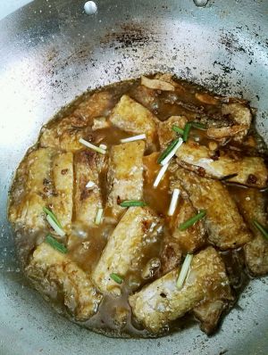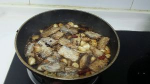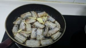 锅里放油,煸炒大蒜,姜出香味,倒入之前煎好的带鱼,继续翻炒让两者的味道相互融合后倒入调好的糖醋汁