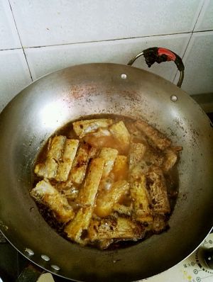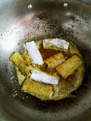 原则上鱼吸干水,沾鸡蛋液或者干粉入油锅煎至两面金黄。我这嫌麻烦,直接捞出扔锅里了······
