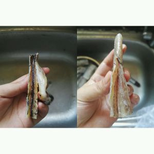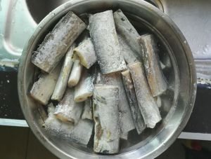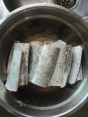 带鱼洗净,去头尾,剖内脏。 我买的是超市直接切好段的,化冻后,处理内脏如图。
