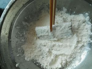 将带鱼段表面上拍层薄薄的粉,将其他的带鱼段做同样的处理;