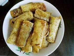 油锅烧起,放入粘好的带鱼,放进去不要随便翻动,直至一边煎黄再翻面煎至