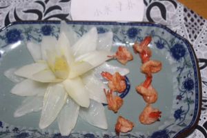 将虾摆盘后,盘子中放一个调料盅,倒入沙拉酱,吃的时候蘸一下,特美味。