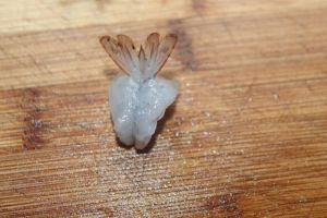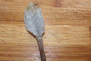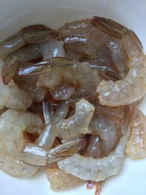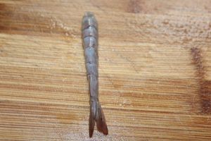 掐掉虾头,去虾线,留下尾巴和最后一节的虾皮。