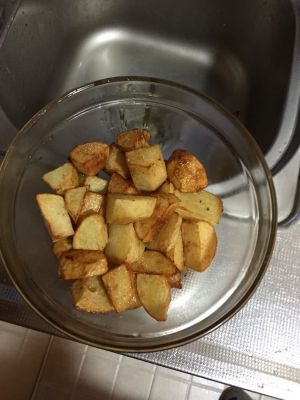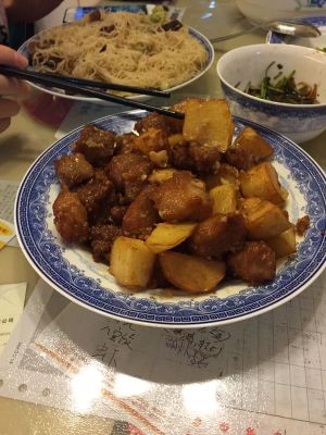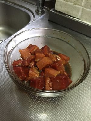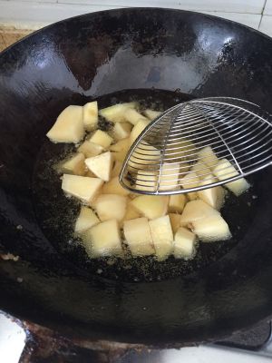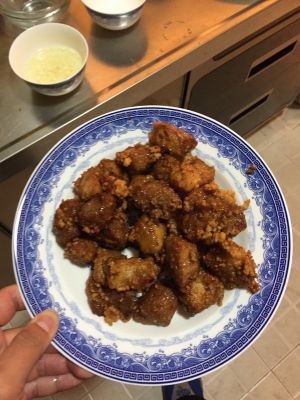 把腌好的肉裹上地瓜粉(我用的是干的,颗粒细小的地瓜粉),起油锅,油温五成热时下裹好地瓜粉的肉块,变色捞出,待油温升至八成时下锅复炸,使之外焦里嫩。