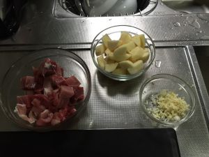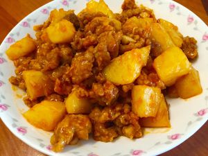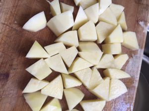 备料:猪前腿肉洗净,用刀背重重拍一下使之松软,切成一厘米见方的小块,土豆切块,蒜切末