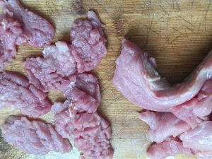 猪里脊肉切簿片,在肉面刻上十字花刀,再切成3cm长2cm宽的斜块