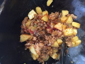将调好的汁倒入油锅炒几下,倒入土豆块,翻炒几下,关火,倒入肉块快速翻炒,起锅