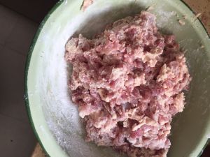 生粉加水稀释开,沉淀后取沉淀下的湿淀粉加入肉片中拌匀,将肉片团成球状
