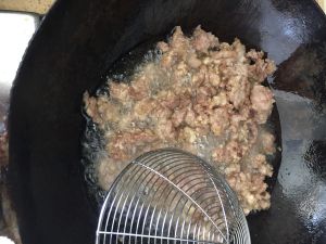 油热后,下肉片炸,改小火炸到变色,捞出,待油温升高,倒入肉复炸一分钟迅速捞出