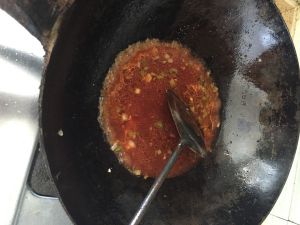 锅内留底油,加入番茄酱,酱油,糖,水煮开,倒入水淀粉勾芡,将肉倒入,和上酱汁后立刻关火出锅