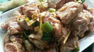 将排骨砍成小块(新鲜排骨)放置料酒、盐、鸡精研制一个小时