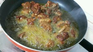 锅里倒油,不需要太多根据排骨的分量,适当与排骨平行,油最后用得不多,煎至略微金黄色后捞起备用