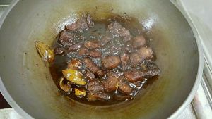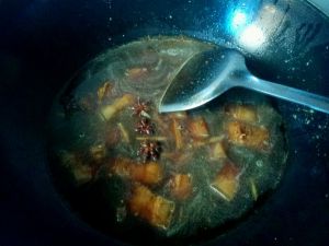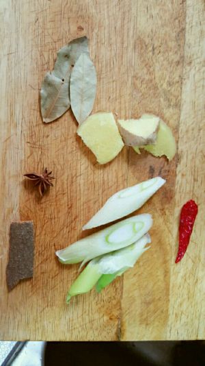 火继续保持中火,等到可以闻见香料的香味时倒入料酒2勺,高度白酒1勺,老抽1勺,陈醋1勺,冰糖2勺(没有可以改用白糖,但是颜色可能不够油亮),加入开水,没过肉即可,改大火烧开!