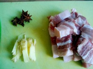 放入八角,姜丝,加入适量清水,食盐,大火烧开后转小火至烧干,收汁