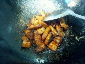 一直煸炒到五花肉有点发紧,颜色有微微的焦黄色以后再倒入葱姜等一起煸炒!这过程保持中火,以免肉炒胡!