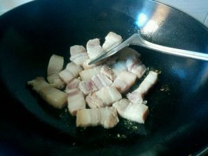 锅里倒油,煸炒过程中五花肉还会出油,所以油不用太多,把控干水分的肉倒进锅里,注意别让油溅到胳膊上!