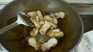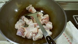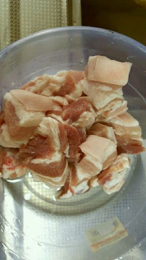 准备好五花肉,切块(最上面那么大就可以),不要切的太小,一定要多冲洗几遍,去除肉里的血,因为我不把五花肉焯水,所以这步很关键!