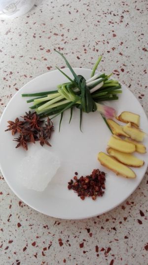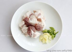 五花肉洗净后切成3厘米见方的块儿,葱姜改刀切小