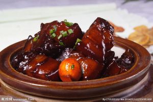 马上把焯好的五花肉放入,迅速翻炒使肉的表面都裹上糖色;然后,倒入料酒、酱油、葱段和姜片翻炒均匀,加入适量的水没过五花肉,大火烧开后,转成小火,盖上盖子炖1个小时左右
