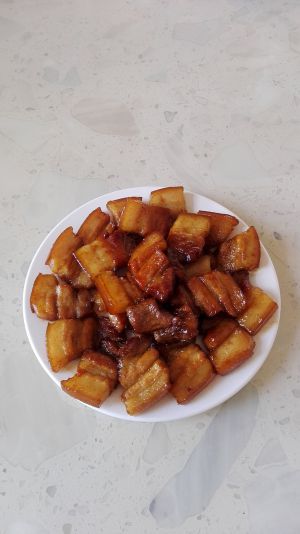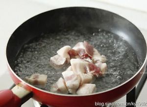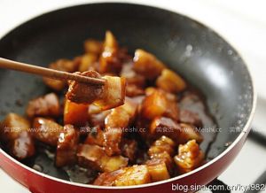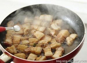 炒至肉微微变黄,这时,炼出来好多油,把多出的油倒出来,这样,做出来的红烧肉不腻