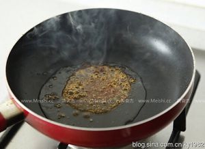 慢慢炒到冰糖溶化变色呈枣红色,油中的大泡变成小泡,小泡快变没的时候,糖色就炒好了