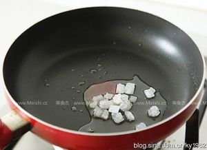 锅烧热后倒入植物油(约60毫升),调成中火,放入冰糖