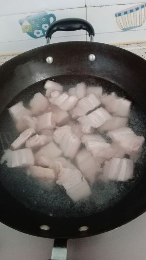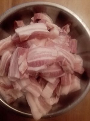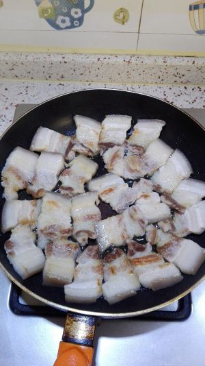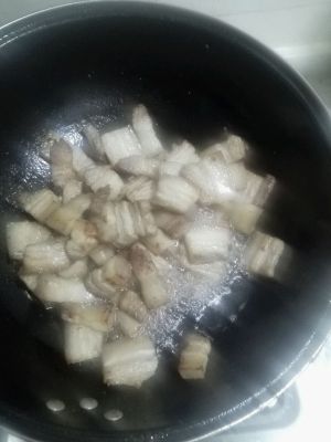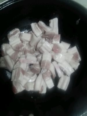 锅里加少许底油,起润滑作用,下五花肉,不断翻炒