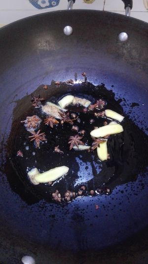 把鸡蛋和肉翻炒加水,水莫过肉为宜,加香叶大料姜片