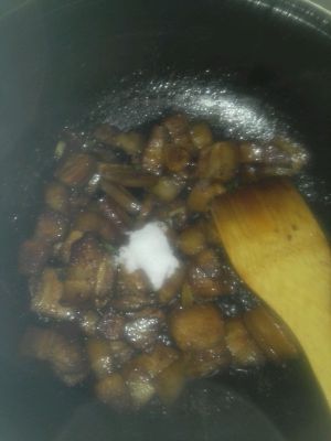 炒出香味后,倒入五花肉,中间加入冰糖四五块,老抽生抽各两勺,盐大半勺进行翻炒。