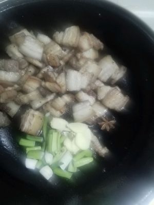 炒锅倒入少许油,将姜片,八角,花椒炒出香味倒入五花肉翻炒,加入料酒,酱油,冰糖,葱,开水等,先大火煮开,再关小火焖!