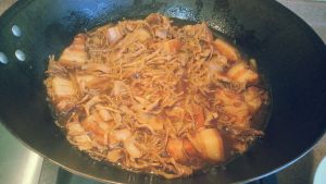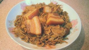 下梅菜笋干,继续煮15分钟以上。煮到汤汁略收干即可