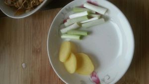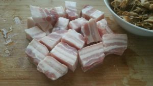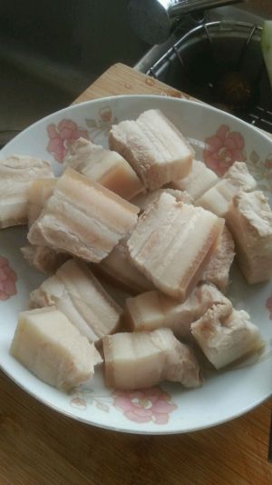 选择肥瘦适宜的五花肉,切成麻将大小的块状。用适量的料酒腌制半个小时以上。