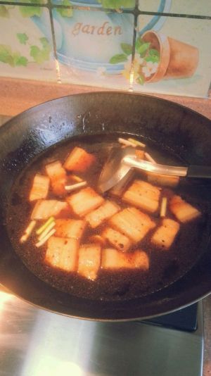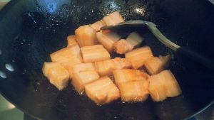 放入五花肉块,不断翻炒,使肉块均匀上色