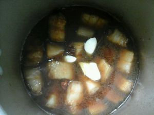 将炒过的五花肉倒入高压锅里 加蒜瓣2粒 姜1大块 并依次加生抽4勺 老抽1勺 料酒4勺 加开水与肉块齐平 开大火至高压锅吹气 小火煮20分钟关火 继续焖10分钟 开盖加入少许冰糖