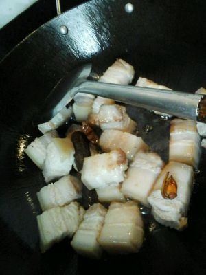 锅烧热放少许油 先放入八角 桂皮煸香 倒入五花肉翻炒至肉变色关火