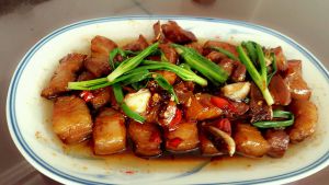 上好的五花肉煎至四面金黄,+冰糖若干个熬出香味,再+料酒至淹没肉
