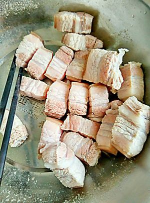 买回来的五花肉切成2.5到3厘米左右的方块放入加水的锅里,烧开后倒出水,肉用温开水洗净备用。