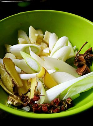 准备好葱、姜、蒜、八角、花椒、香叶、桂皮、肉蔻、等调料(花椒、香叶、桂皮、肉蔻如果没有也可以不加,我有时候还会放入辣椒也很好吃,根据自己口味放入)