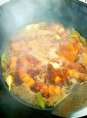 焯水后的五花肉放到油锅里加上冰糖炒到变成这样的颜色,放入砂锅倒入一杯白酒,一杯酱油,一勺胡椒粉,四碗水煮开后小火焖大概用筷子能插入肉里,放入土豆过多十分钟放葱段