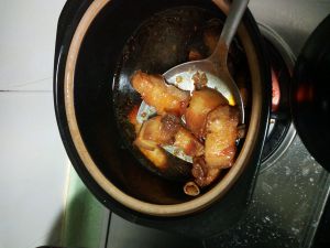 加入60度左右的热水,水量要超过肉再多一些,放入老抽、料酒、小火炖40分钟左右。