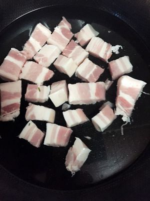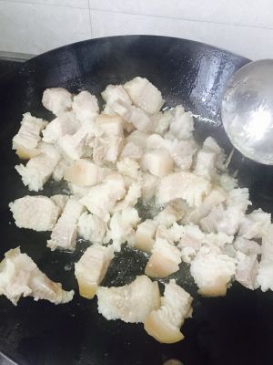 待油燒熱(不可過熱)後,倒入汆燙好的五花肉翻炒。