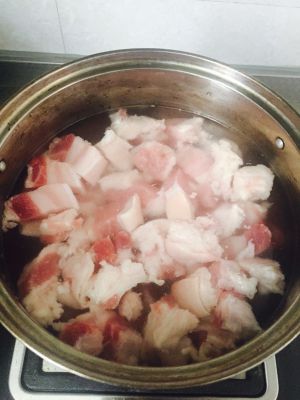 水燒開後把切好待用的五花肉放入水中,汆燙一下。這樣可以去掉肉肉上多餘的油脂和血水,使得肉燒好了以後肉香味更純更濃。