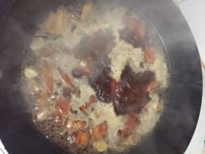 20分钟之后加入红糖、生抽,大火烧5分钟后,加入一勺老抽调色